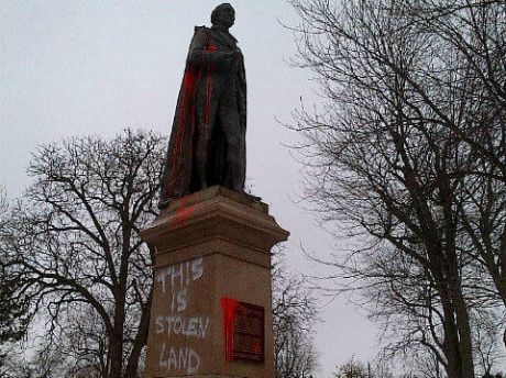 The old saying that history is written by the victors is made evident in the monuments that adorn—or rather, that pollute—our public spaces. The central park in London, Ontario, where I grew up was named after Queen Victoria, Empress of India, and prominently featured a cenotaph, a veterans’ plaque, a statue in tribute to the Boer War and a decommissioned WWII Sherman tank.