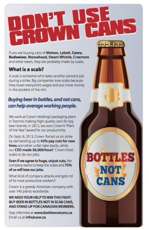 Crown Holding is one of the world’s largest manufacturer of food and beverage cans with a profitable income that gave its CEO an average of $13 million/year in the past five years. Its Toronto’s facility was ranked as one of the top producers in North America and received an award for their outstanding safety, productivity and budget management in 2012. Now, Crown Holding is manufacturing cans using scabs labour and ignoring the workers who made it nearly double its profits—from $282 million in 2011 to $557 million in 2012.