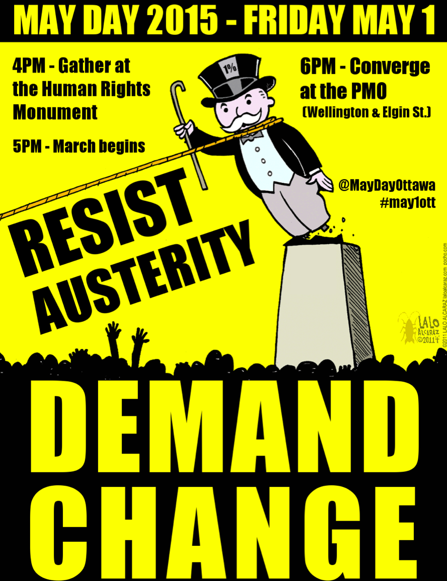 Endorsed by: Ottawa and District Labour Council, Canadian Association of Professional Employees (CAPE), Canadian Union of Public Employees/Syndicat canadien de la fonction publique (CUPE Local 2204, Ottawa CUPE District Council), Canadian Union of Postal Workers/Syndicat des travailleurs et travailleuses des postes (CUPW Local 580 - Ottawa Local, CUPW Central Region), Ontario Public Service Employees Union/Syndicat des employés de la fonction publique de l'Ontario (OPSEU Region 4), Ottawa ACORN, Ottawa Peace Assembly, Conseil régional d'action politique de l'Outaouais (CRAPO – AFPC/PSAC), PSAC Ottawa Area Council (AFPC/PSAC), Hugo Chavez People's Defence Front, Communist Party of Canada – Ottawa, Anakbayan Ottawa, Philippine Migrants Society of Canada (PMSC), The International Socialists, and Solidarity Against Austerity (SAA).