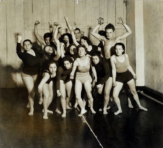 "It was the time of the Great Depression and the labor movement of the 1930s. Workers’ groups along a wide political spectrum were formed, and dancers joined, in turn forming the Workers’ Dance League and the New Dance Group. The dancers, often divided by ideology and allegiances, struggled to reconcile revolutionary and bourgeois dance—dance that proclaimed the workers’ movement of the future and also dance inherited from traditional forms, even incorporating the new, personalized forms developed by Martha Graham. “Their muscles (and joints) and sinews were trained to express power—artistic and social. Clenched fists, aggressive lunges, and themes of hard physical work were common in revolutionary dance” (Graff)."