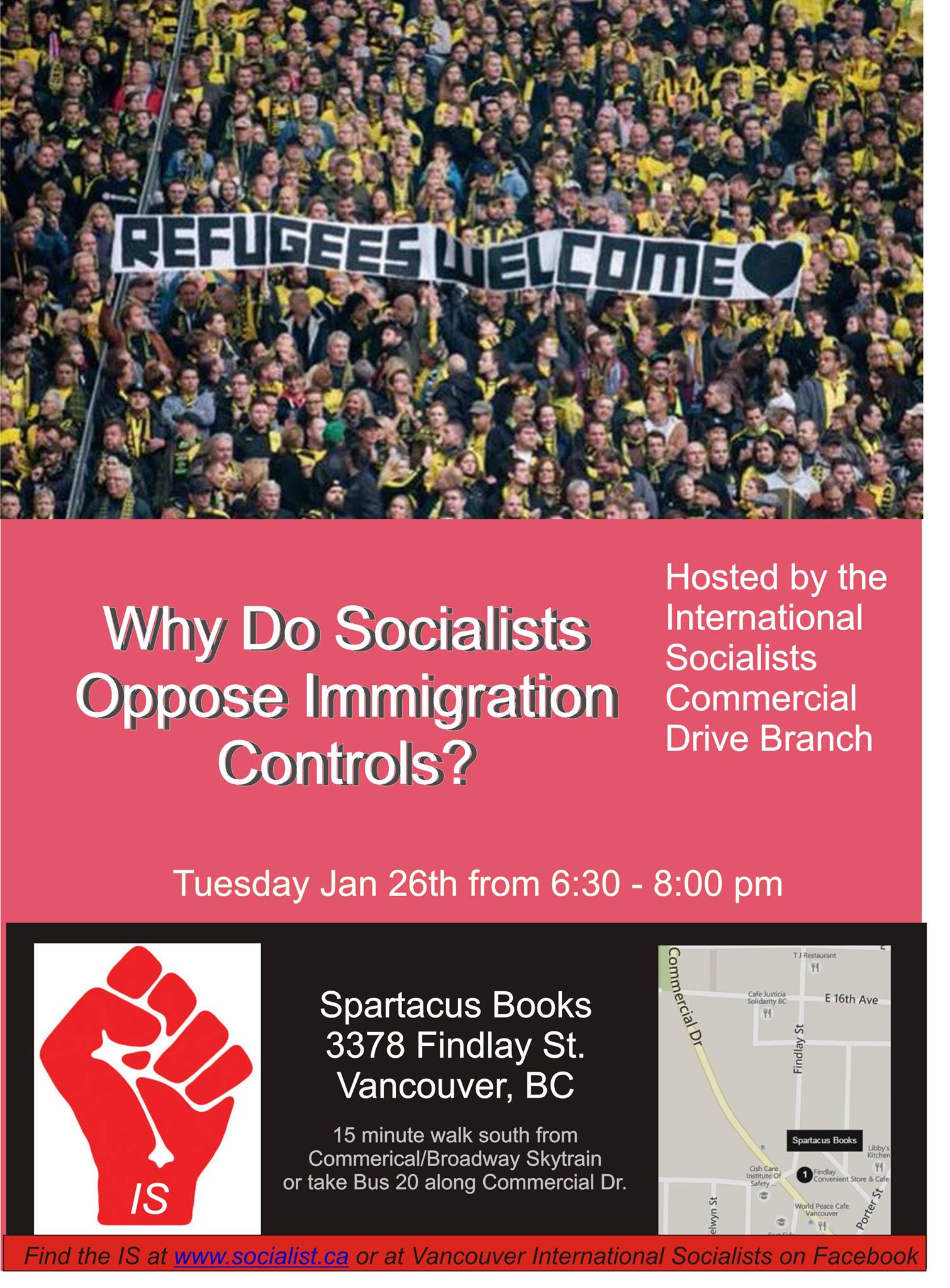 The worst refugee crisis since WWII has exploded as war, climate change and austerity drives millions to flee their homes in desperate search for a better life. Refugees Welcome rallies across Europe and in Canada show the desire for an alternative to the often cruel and oppressive immigration and refugee policies implemented by many countries including Canada. Yet, many who want to help refugees still accept that there must be limits on the refugees and immigrants we take in every year out of fear for the economy, jobs, culture and/or terrorism. We will discuss the socialist case for abolishing all immigration controls and why we have more in common with the immigrants and refugees than we do with our own ruling elites. A world without borders is possible.