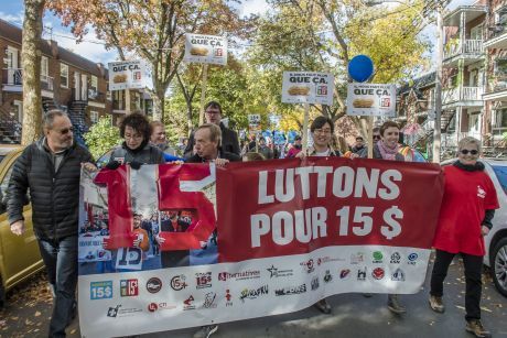 In addition to a $15 an hour minimum wage, the “5, 10, 15” coalition aims for 5 days’ notice of scheduling, and 10 paid sick days. “5-10-15” includes the CSN – the other major union federation in Quebec – and two other smaller union federations, the CSD and CSQ, as well as important community organizations like Au bas de l’echelle (“At the Bottom of the Scale”) the FDNS (Front in Defence of Non-unionized Workers), the Immigrant Workers’ Centre, and the “Collective for a Quebec Without Poverty.” The campaign as a whole is also supported by Quebec solidaire (which had a contingent of 200 on the October 15 march, and helped initiate the launch of the campaign in Gatineau).