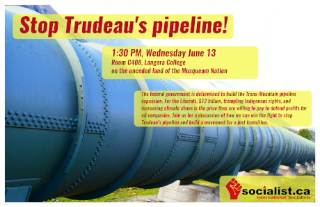 The federal government is determined to build the Trans-Mountain pipeline expansion. For the Liberals, $12 billion, trampling Indigenous rights, and increasing climate chaos is the price they are willing to pay to defend profits for oil companies. Join us for a discussion of how we can win the fight to stop Trudeau’s pipeline and build a movement for a just transition.