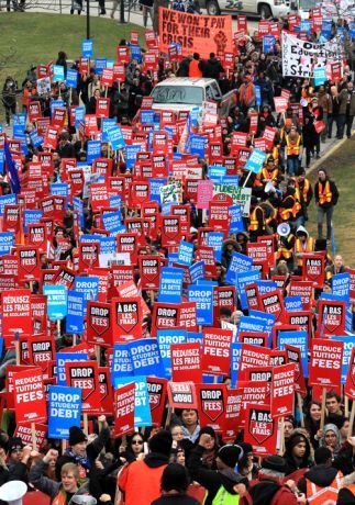 In Toronto, thousands of students from multiple campuses converged at the University of Toronto, marched through downtown and rallied at Queen’s Park. Students are facing skyrocketing tuition fees and massive levels of debt. On top of chronic education cutbacks and underfunding, students are being made to pay for the economic crisis they did not create.